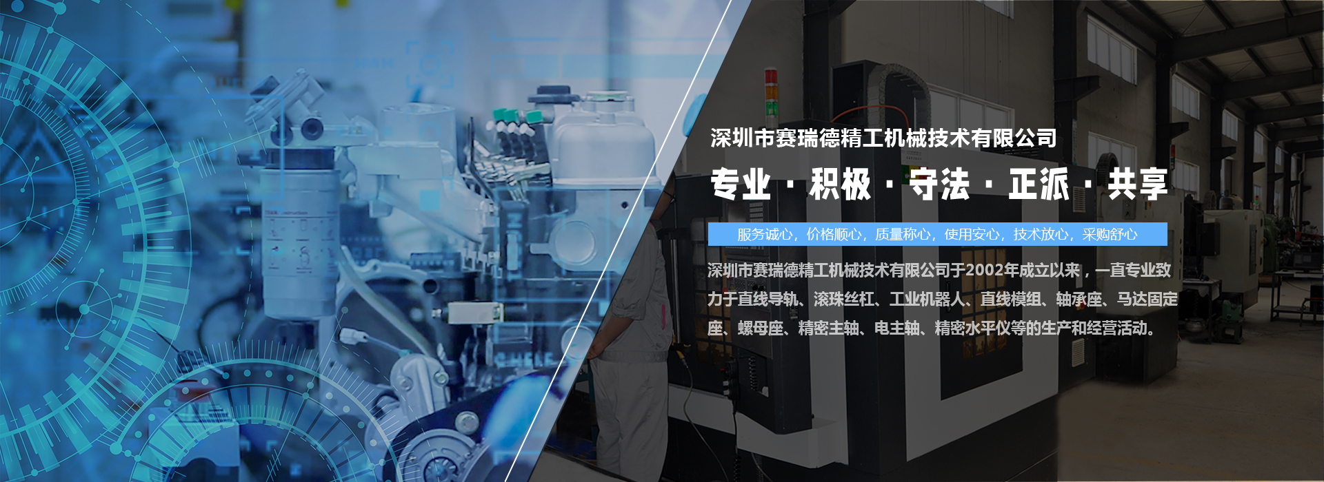 深圳市賽瑞德精工機(jī)械技術(shù)有限公司于2002年成立以來,一直專業(yè)致力于直線導(dǎo)軌、滾珠絲杠、工業(yè)機(jī)器人、直線模組、軸承座、馬達(dá)固定座、螺母座、精密主軸、電主軸、精密水平儀等的生產(chǎn)和經(jīng)營活動。